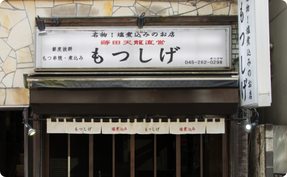 横浜・野毛発祥の居酒屋「もつしげ」。鮮度抜群な「モツ」を丁寧に焼き上げた串焼きと、手間ひまかけたこだわりの「塩もつ煮込み」が評判です!